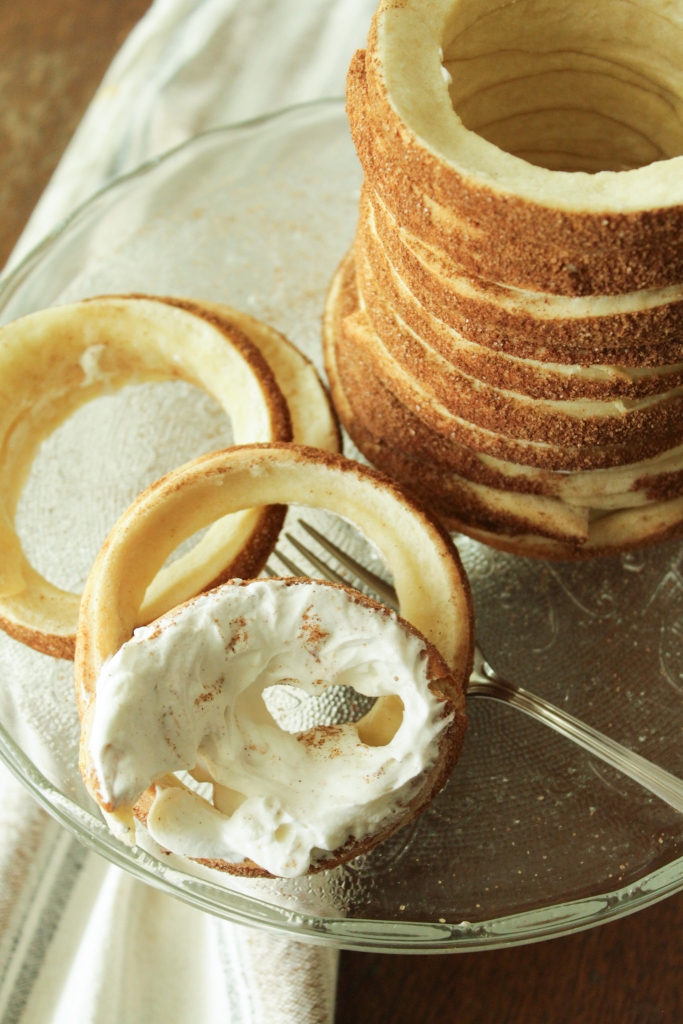 For our version of this special treat, we’re recommending a homemade dough that you bake in the oven. However, you can just as easily use pre-made and store-bought cinnamon dough in place of a homemade dough and, as mentioned, roasted over a late-summer campfire to get a similar result. To achieve the iconic cylinder shape of this cake when baking in the oven, use four empty cans or wooden rolling pins to wrap the dough around.